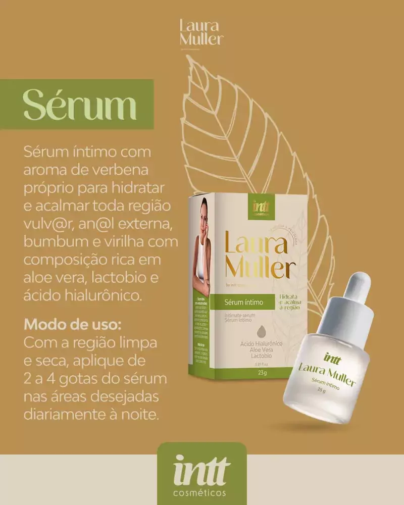 O Sérum íntimo by Laura Muller é composto pôr Aloe vera, Lactobio e Ácido Hialurônico que são ativos que promovem mais hidratação, melhora na elasticidade da pele e ação calmante. Torne seus momentos de autocuidado uma rotina de amor-próprio.